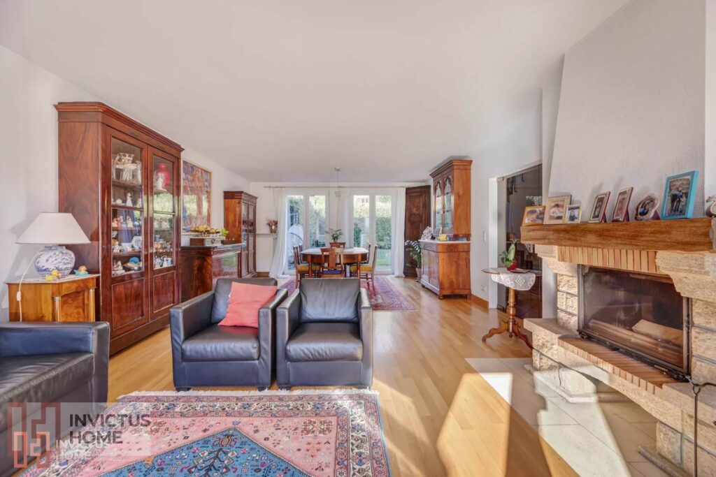Au rez-de-chaussée le hall d’entrée dessert d’un côté une grande pièce de vie incluant salon et salle à manger, avec un joli feu ouvert... à bois, et de l’autre côté une moderne cuisine entièrement équipée, un coin vestiaire, une toilette d’invités et un bureau. Toutes les pièces de vie donnent accès au jardin et à sa terrasse de plus de 30 m2 à l’arrière de la maison, et une deuxième terrasse exposée Sud s’étale sur toute la largeur de la maison à l’avant.