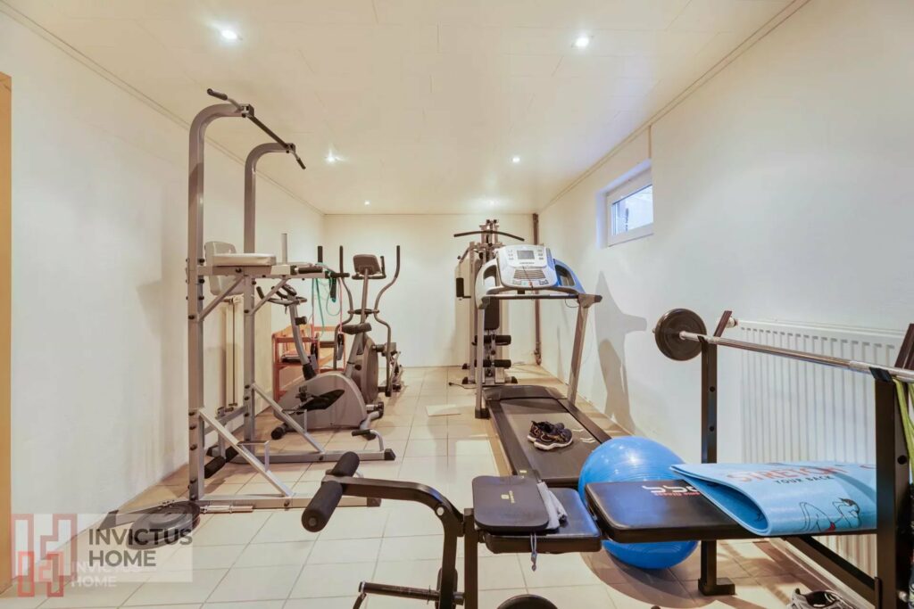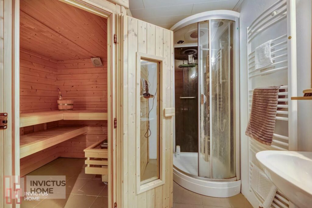 Au sous-sol est aménagé un espace wellness avec sauna et douche, une buanderie, un double garage intérieur, un local technique chauffage.. À l’extérieur, la propriété permet encore un stationnement privatif de trois voitures supplémentaires.