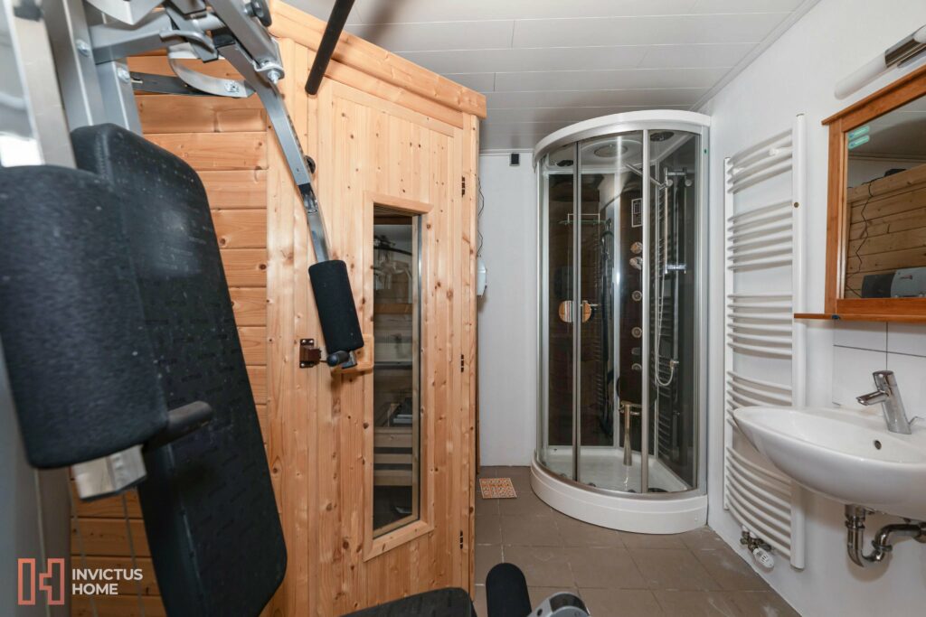 Im Untergeschoss befindet sich ein Wellnessbereich mit Sauna und Dusche, eine Waschküche, eine innere Doppelgarage, ein Heizungsraum... Im Außenbereich können drei weitere Autos geparkt werden.