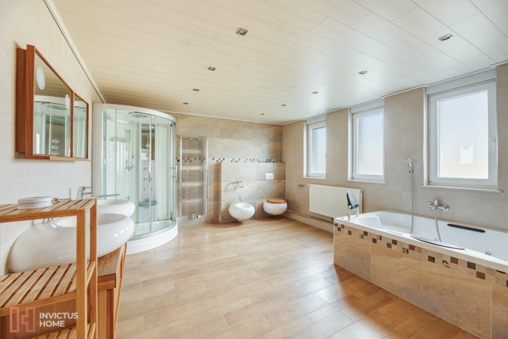 Im Obergeschoss befinden sich drei geräumige Schlafzimmer und ein sehr großes und helles Badezimmer mit Jacuzzi und italienischer Dusche, das durch drei Fenster belüftet wird, sowie ein schönes Elternschlafzimmer. Das ausgebaute Dachgeschoss bietet einen Open Space, der als Spielzimmer oder Hobbyraum genutzt werden kann.