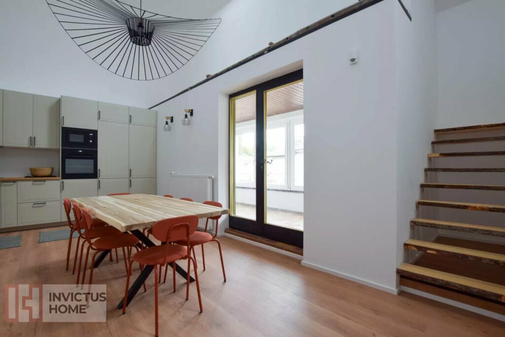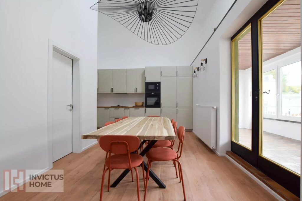 * eine große, voll ausgestattete Küche mit einer Deckenhöhe von 4m, die auch auf eine Veranda führt und mit ein paar Stufen zum Wohnbereich.