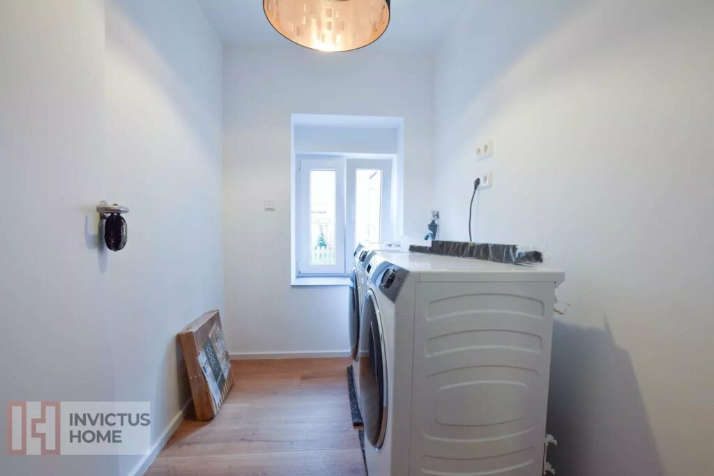 * eine voll ausgestattete Waschküche mit Waschmaschine und Wäscheleine.