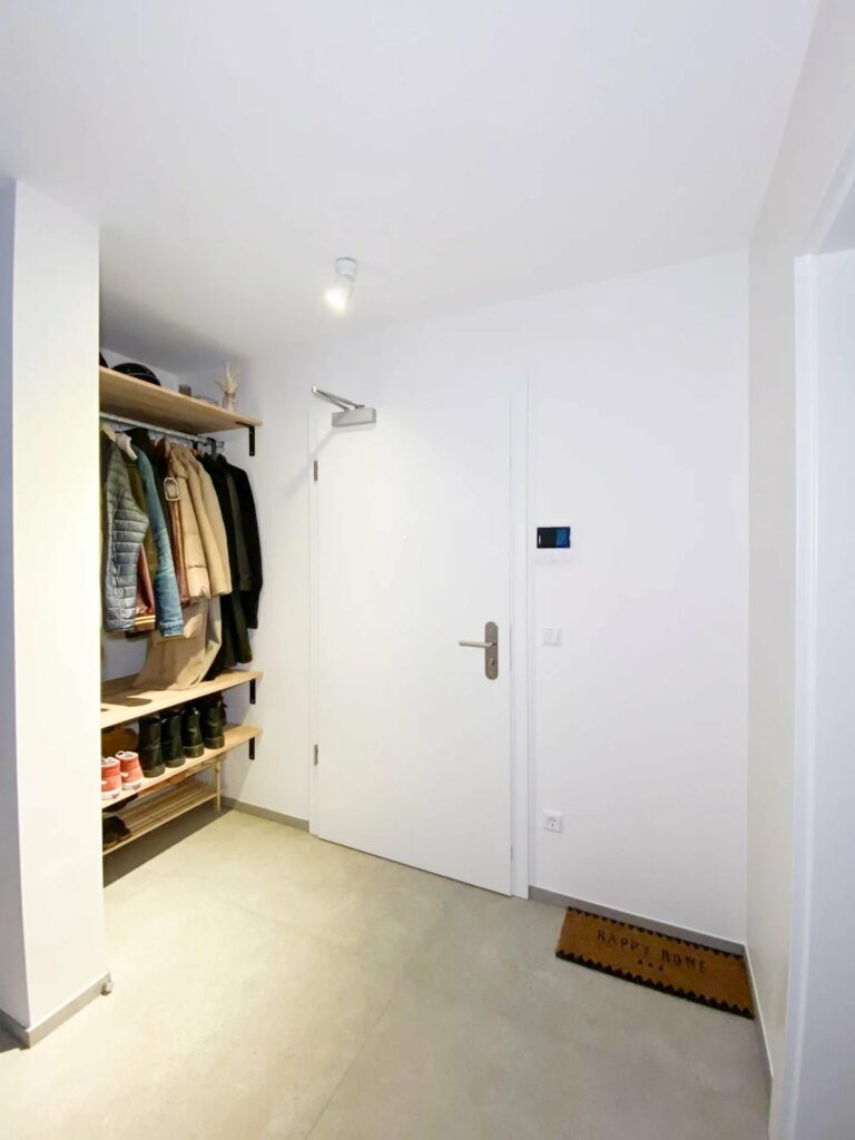 D...ie Wohnung ist mit einer Garderobe am Eingang ausgestattet und verfügt über folgende Möbel: mehrere Kleiderschränke, ein Doppelbett mit Matratze, ein Sofa, einen Esstisch mit Hochstühlen, ein TV-Möbel, Leuchten und Vorhänge in allen Räumen.