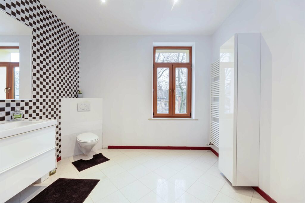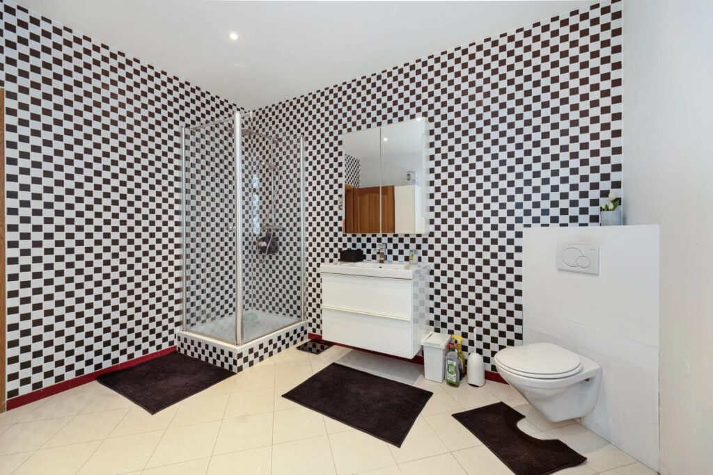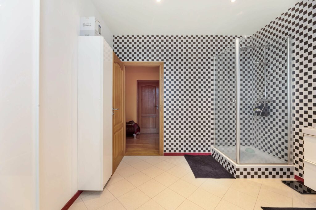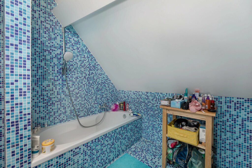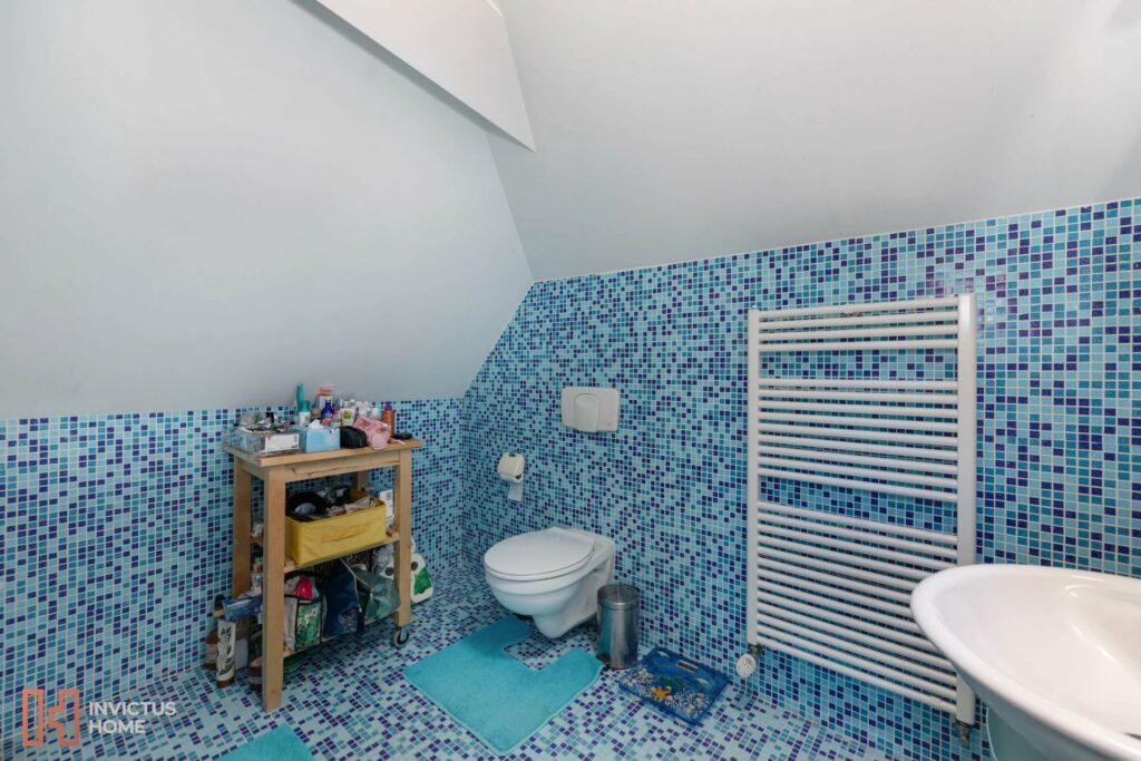 À l’étage se trouvent trois spacieuses chambres à coucher, et une très grande et lumineuse salle de bains avec douche et équipée d’une fenêtre. Le pallier prévoit une buanderie.