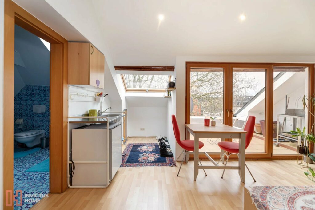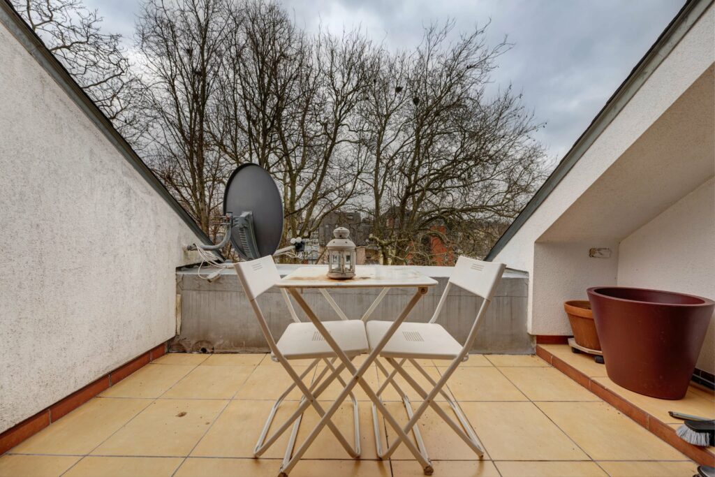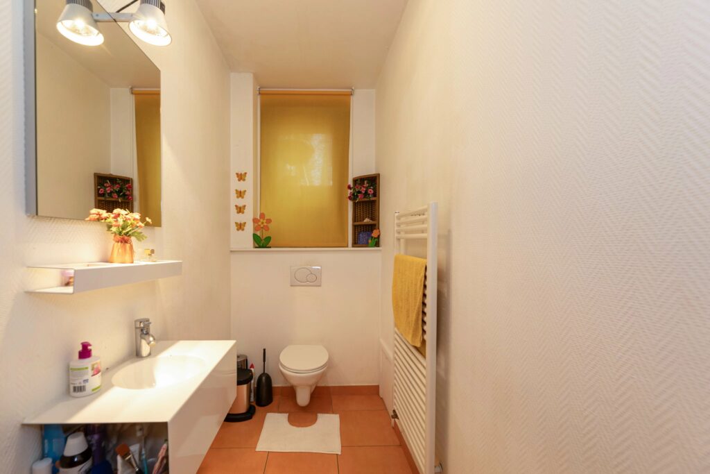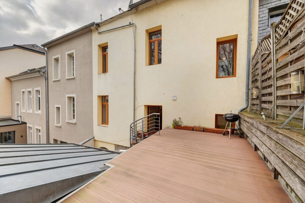 Depuis la cuisine, un accès à la terrasse est prévu avec une vue dégagée sur la ville. Un wc séparé se trouve sur le pallier.