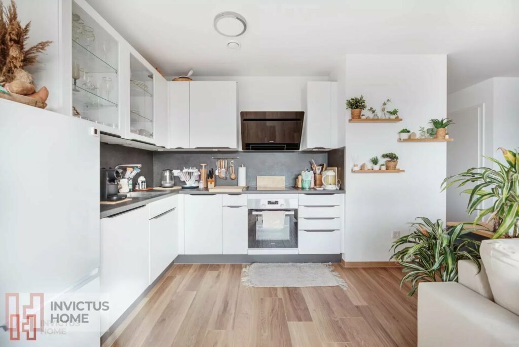 Le hall d'entrée mène vers l'espace de vie, comprenant cuisine ouverte sur salle à manger et salon, avec de grandes portes fenêtres exposées sud.