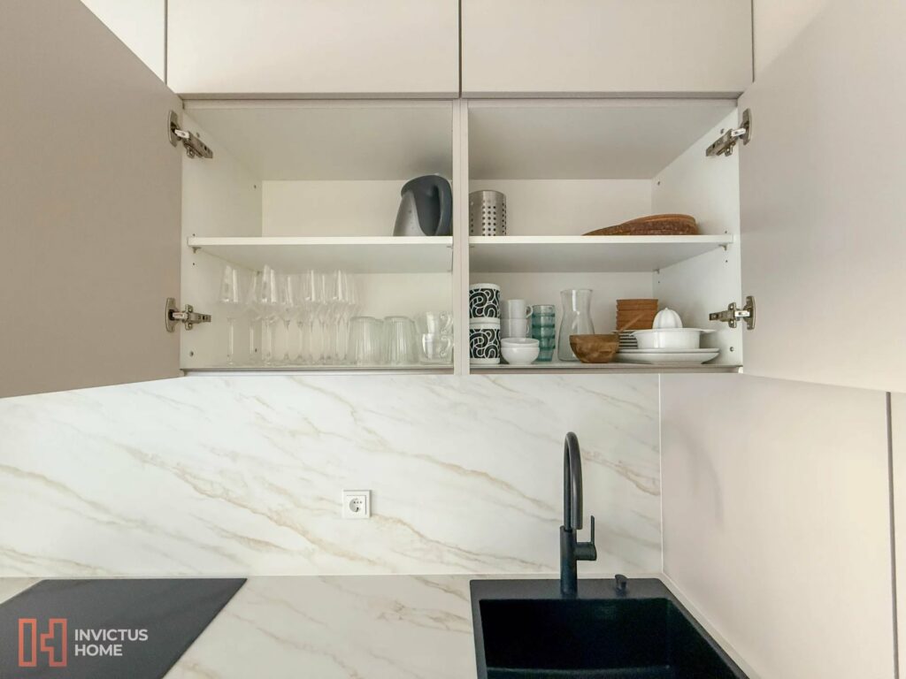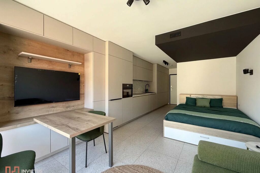 Le studio a une surface d'environ 30 m², et il est compo...sé d'un open space avec armoires sur mesure (mobilier Kicheconcept), d'un petit balcon, et d'une salle de douche moderne.