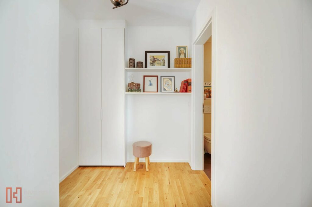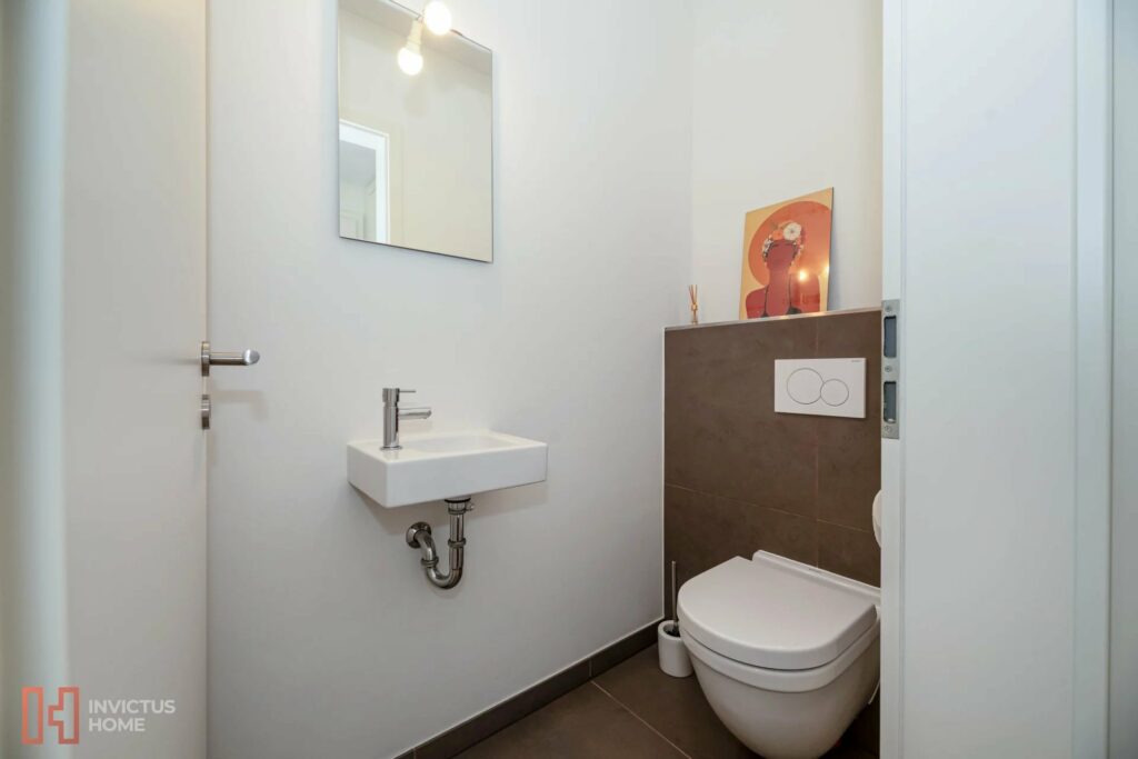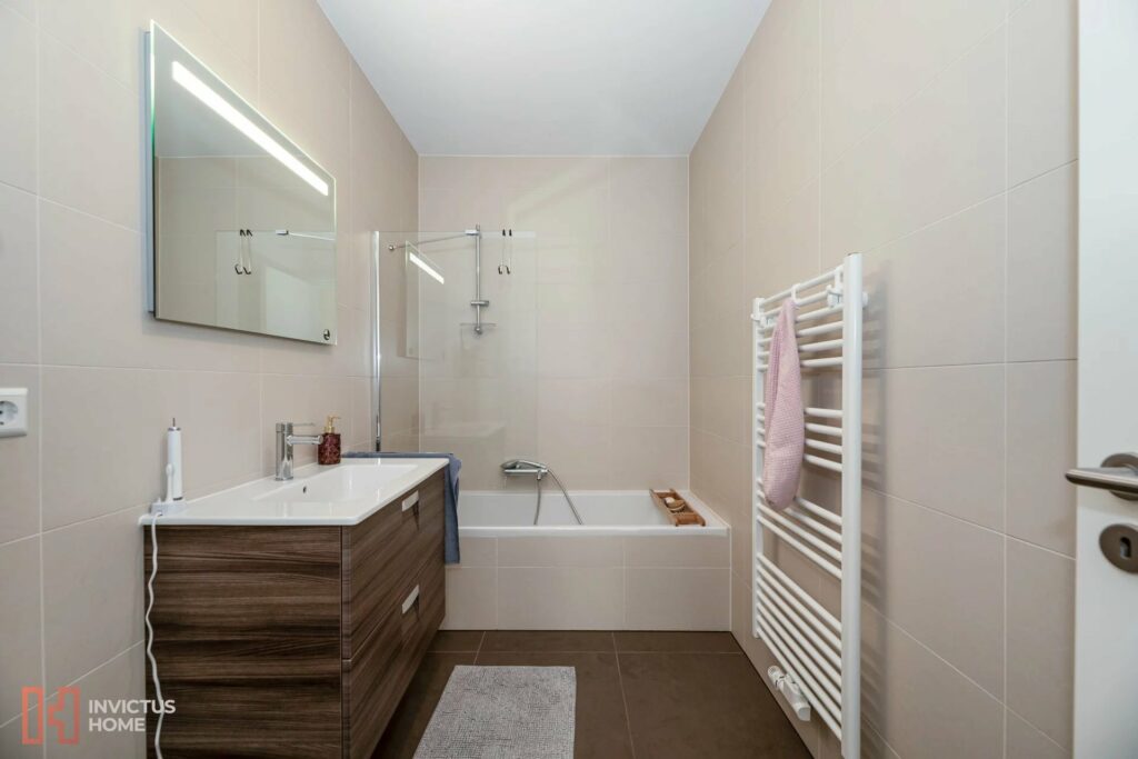L´appartement est équipé d´une salle de bains avec douche/baignoire, et un grand lavabo, ainsi qu´un wc séparé. Le hall d'entrée est bien agencé avec espace vestiaire sous forme d'une armoire intégrée.